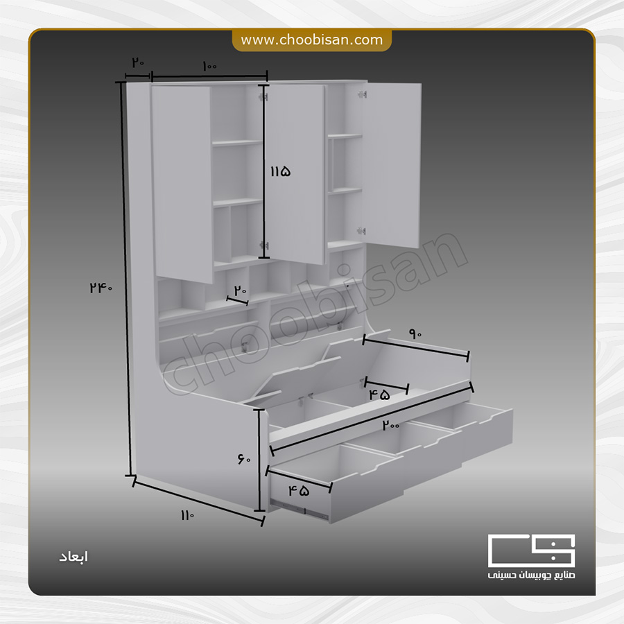 | اجزا | تاج و پاسنگ / بدنه تخت/ باکس 3 کشو/ باکس 3 درب/ کتابخانه و دکوری |